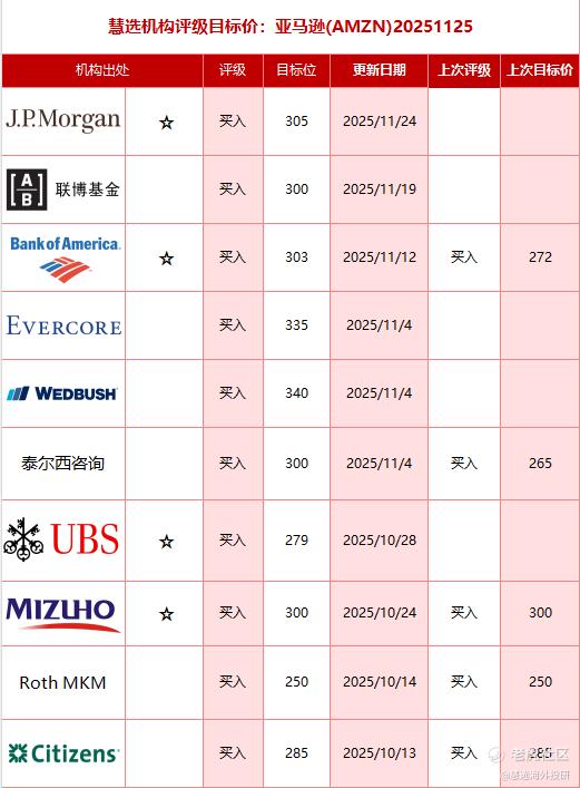 摩根大通对亚马逊的核心观点是“买入”评级,该行认为,亚马逊当前的估值(2025年11月19日总市值约2.42万亿美元)已充分反映了其长期增长潜力,但高额支出与云业务盈利的不确定性可能限制其股价的进一步上涨。该行建议投资者“等待更优买入时机”,并关注亚马逊在AI技术商业化与云业务效率提升方面的进展。