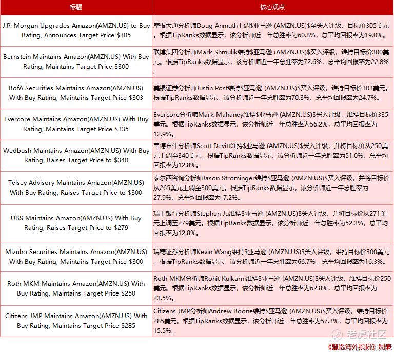 摩根大通分析师Rothschild & Co Redburn对亚马逊的评级依然是“买入”,目标价305美元。