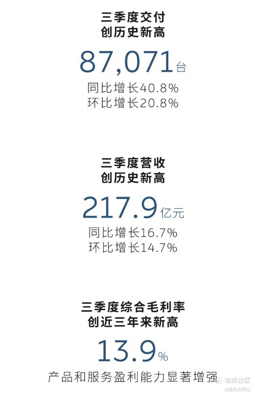 先看最硬核的几项数据。三季度,蔚来交付了87,071台车,同比增长40.8%,环比也增长了20.8%,创下了季度交付量的历史新高。伴随着销量攀升,营收也水涨船高,达到217.9亿元人民币,同样创下历史纪录。更值得玩味的是其盈利能力的改善:三季度综合毛利率回升至13.9%,整车毛利率更是达到了14.7%,两者均为近三年来的最高水平。