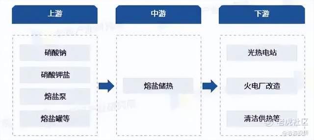 如果我们把熔盐储能的产业链拆开,其上游主要由原材料及零部件构成,主要原材料为硝酸钠、硝酸钾等,中游为熔盐储热技术供应商,下游则是我们前面聊到的几个应用场景,其中光热发电和火电改造是最重要的两个应用场景。