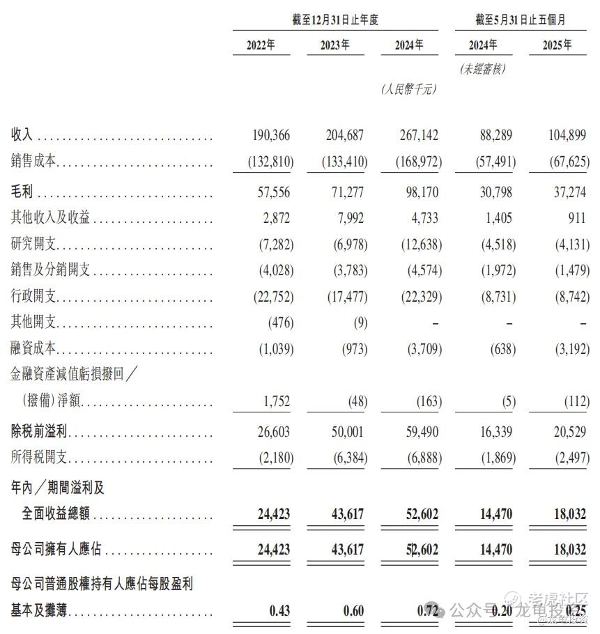 毛利:2022年毛利5755.6万人民币,2023年毛利7127.7万人民币,2024年毛利9817万人民币;截至2025年5月31日止最近12个月毛利1.05亿人民币。