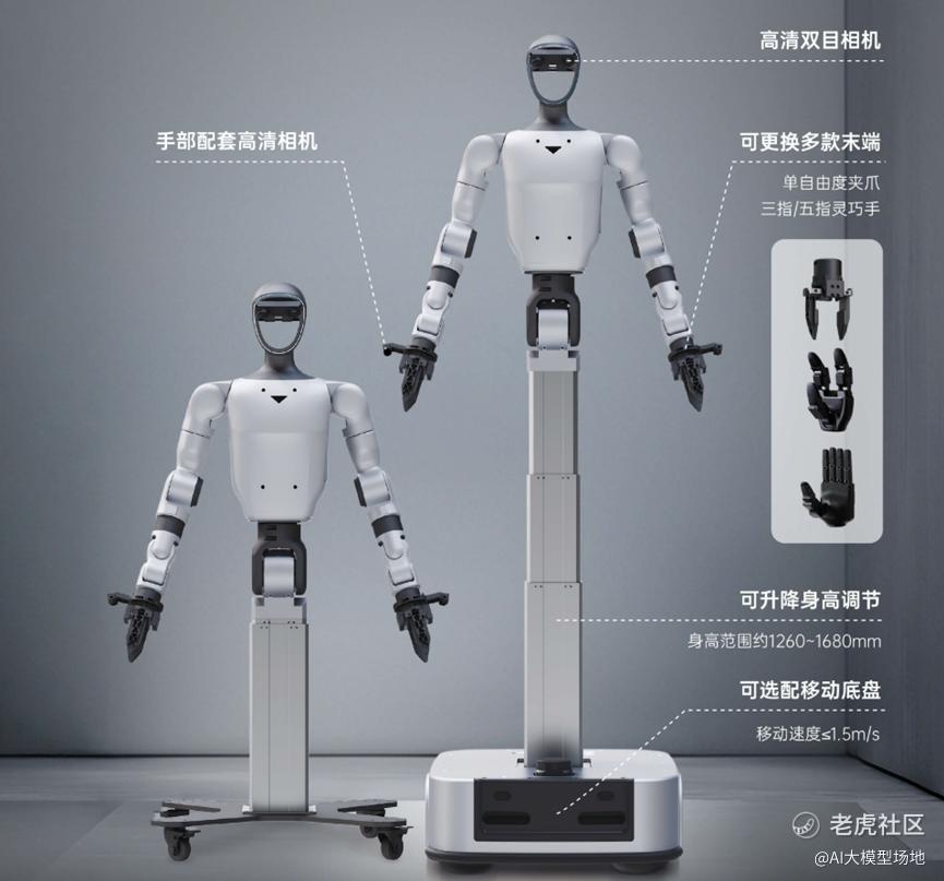 机器人头部搭载高清双目相机,腕部也配套了高清相机,尤其是还能选配移动底盘,旗舰版的移动底盘速度为1.5m/s,原地360°旋转也没有任何问题,续航也直接拉满,6个小时,和我工作一天也就差俩小时,况且它不懂摸鱼,更不用中途吃饭。