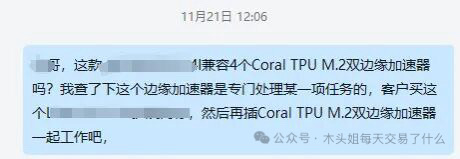 谷歌的TPU芯片,我在上周有遇到这个类似于这个问题,这个老外是想拿我们的产品跟Coral M.2双边缘加速器一起搭配使用,查了下就是加速某一项任务的使用,就好像餐厅的厨子你要配菜还要炒菜,空闲的时候还要负责上菜。现在只要你专门做炒菜这项任务,对比通用型的师傅,你的专业能力可以发挥的更好。