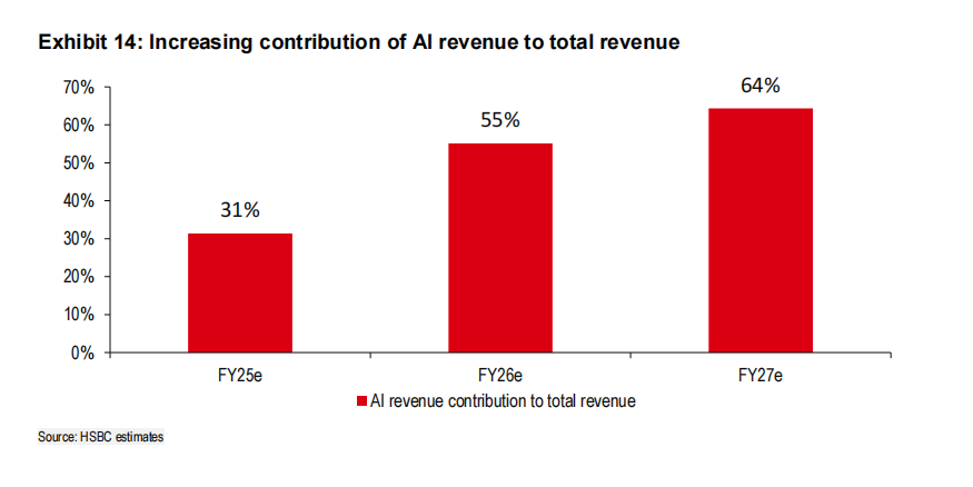 根据我们的预估,AI收入对总收入的贡献将继续呈指数级增长,从2025财年预测的31%增至2027财年预测的64%。因此,我们更高的AI收入预估也驱动了每股收益的显著增长。我们相信上行空间巨大,以至于市场共识的2027财年预测每股收益可能在2026财年预测即可实现。我们预估的2026财年预测每股收益为11.68美元,仅比市场共识的2027财年预测每股收益12.31美元低5%。