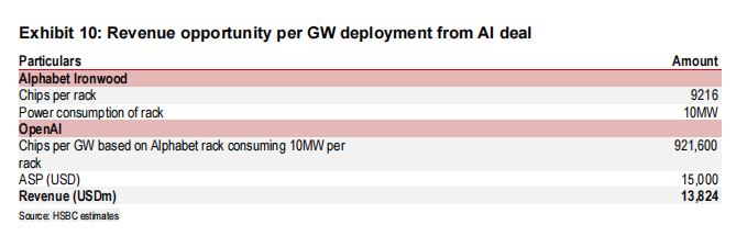 我们尝试通过假设博通负责芯片设计(其芯片性能可与Alphabet的最新代TPU v6即Ironwood相媲美)来量化OpenAI交易带来的收入机会。Ironwood的一个Pod包含9,216个芯片,每个Pod功耗为10兆瓦。我们通过假设OpenAI的芯片将与Ironwood TPU性能相当来推断收入机会。基于我们对每个芯片15,000美元的平均销售单价假设,我们估计OpenAI交易带来的收入机会可能为每千兆瓦部署约140亿美元。这低于市场基于近期GPU交易的一些乐观预期(每千兆瓦200-300亿美元)。根据我们的估算,该交易的终身价值对ASIC收入而言可能达到1400亿美元,并且网络收入还存在进一步的上升空间。