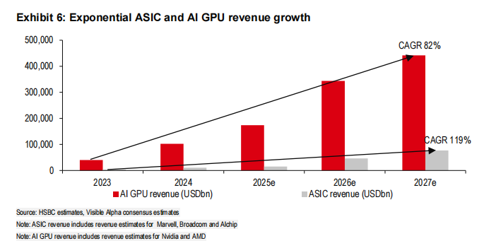 超大规模企业的资本支出增长势头可被视为ASIC增长的代理指标,因为所有超大规模企业目前或未来都在博通或其同行公司拥有ASIC项目。今年以来,市场对云服务提供商2026财年预测和2027财年预测的资本支出共识预期已分别上调了40%和63%,因为超大规模企业继续预期在AI领域进行积极投资。虽然我们继续预期云服务提供商资本支出中的大部分AI支出将流向AI GPU,但我们认为云服务提供商资本支出的扩张也意味着ASIC公司总潜在市场规模的扩大。我们仍然预期ASIC的支出将持续增加,因为我们预计其在云服务提供商总资本支出中的占比将从2023年的2%增长至2027财年预测的13%。此外,我们预估2023年至2027财年预测期间,ASIC收入的年复合增长率为119%,将超过我们预期同期年复合增长率为82%的AI GPU收入。