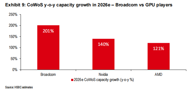 受核心客户更强的 ASIC 增长势头推动,我们继续预计博通在 2026 年预估中将实现 201% 的最高 CoWoS 年同比产能增长。这显著高于英伟达 140% 的 2026 年预估 CoWoS 增长和 AMD 121% 的增长。