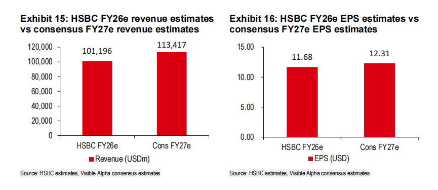 此外,我们相信博通能够在2026财年预测实现市场共识对2027财年预测的每股收益预期,因为我们预测的2026财年预测每股收益11.68美元,仅比市场共识的2027财年预测每股收益12.31美元低5%。