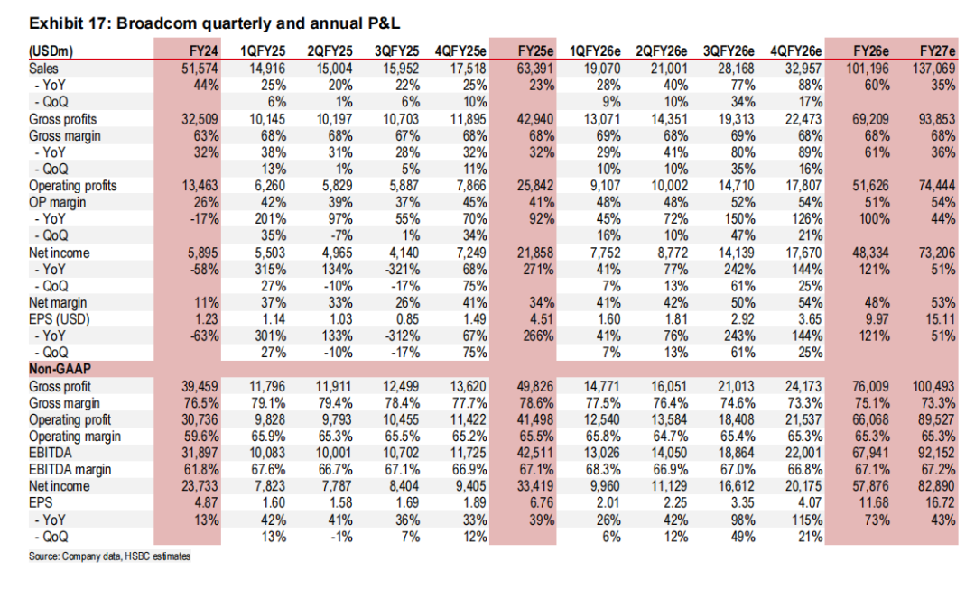 从新闻稿来看,目前尚不清楚博通是否参与芯片设计,或者机架扩展是否将使用博通的以太网技术。尽管此项合作可能在后期带来可观的收入贡献,但我们相信,其核心客户带来的近期强劲增长势头已足以使博通在业绩上给市场带来上行惊喜。