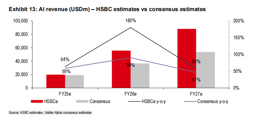 强劲的ASIC势头加上网络收入的上行空间,可推动AI收入实现前所未有的增长。我们预计2026财年预测的AI收入为558亿美元,意味着同比增长180%,比市场共识的367亿美元高出52%。我们预计2027财年预测的AI收入为882亿美元,意味着同比增长58%,比市场共识的534亿美元高出64%。
