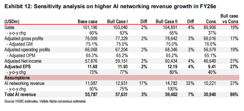 我们基于人工智能网络总可用市场(TAM)扩张推动2026财年预测人工智能网络增长高于预期这一假设进行了敏感性分析。在我们的第一个看涨情景下,我们假设2026财年预测人工智能网络收入同比增长75%。这为我们基准情景的每股收益带来了额外的2%隐含上行空间。在我们最乐观的情景下,我们假设2026财年预测人工智能网络收入同比增长100%。这为我们基准情景的每股收益带来了额外的4%潜在上行空间。我们最乐观情景下的隐含每股收益比共识预期高出27%。