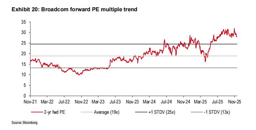重申买入评级;将目标股价上调至535美元(原为400美元): 我们的535美元目标股价是通过将2027财年预测目标市盈率32倍(原为31倍)应用于我们预测的2027财年每股收益16.72美元(原为12.85美元)得出的。鉴于隐含上涨空间约35%,我们维持对该股票的买入评级。我们相信ASIC和AI网络收入的上行空间可以帮助博通朝着其2027财年预测峰值市盈率32倍的方向进行价值重估。