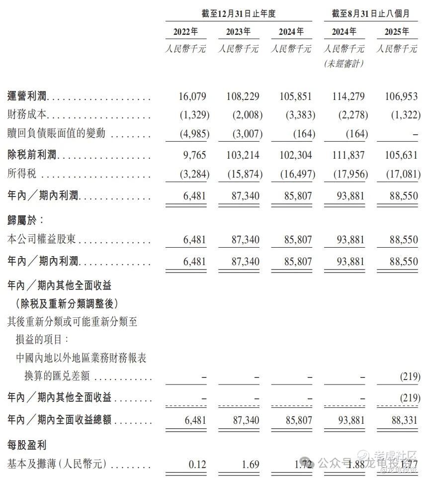 年内溢利:2022年净利648.1万人民币,2023年净利8734万人民币,2024年净利8580.7万人民币;截至2025年8月31日止最近12个月净利8025.7万人民币。