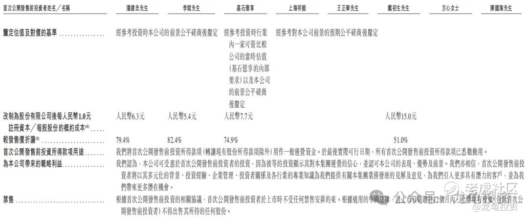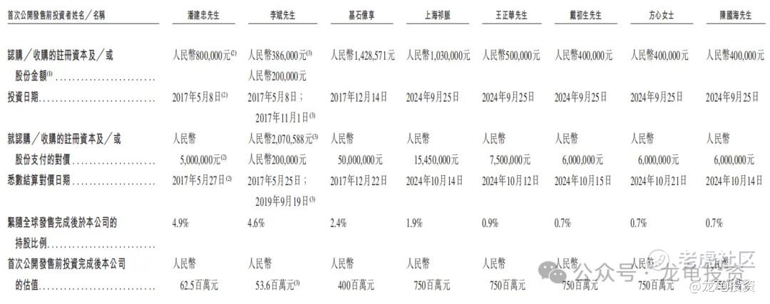 公司首次公开发售前投资总共8位投资,最后投资完成时间2024年10月14日,投后估值7.5亿港元,每股成本15元人民币,较发售价折让51%;