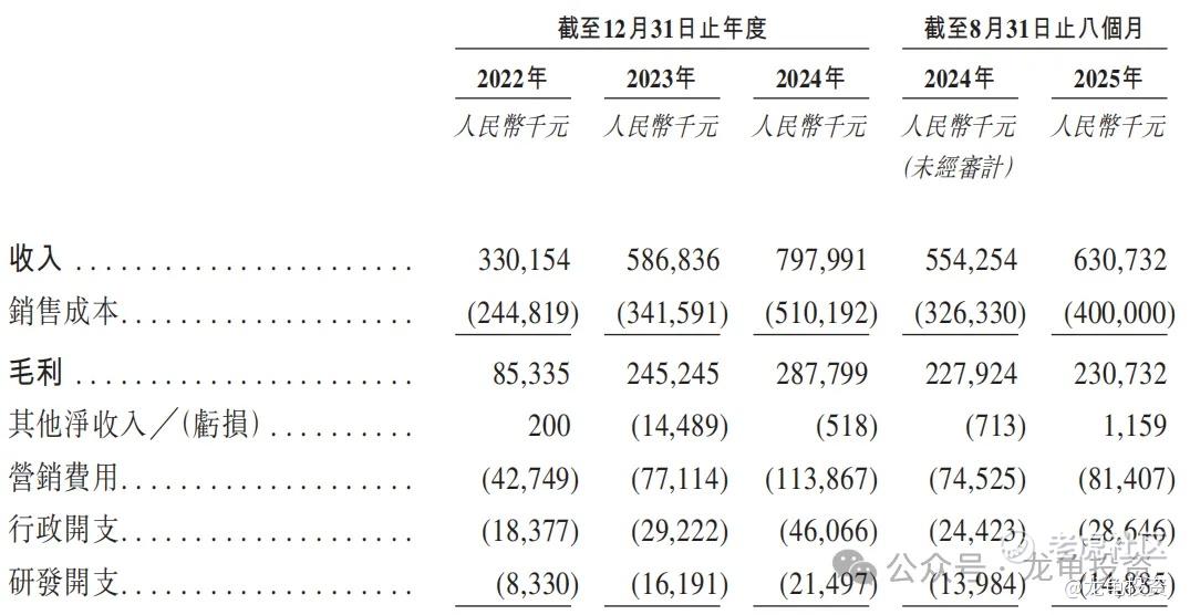 毛利:2022年毛利8533.5万人民币,2023年毛利2.45亿人民币,2024年毛利2.87亿人民币;截至2025年8月31日止最近12个月毛利2.91亿人民币。