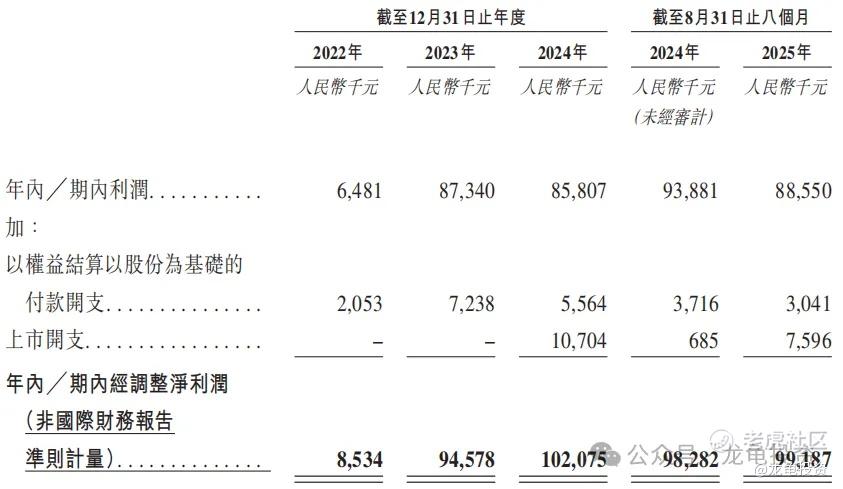 经调整后净利润:2022年经调整后净利853.4万人民币,2023年经调整后净利9457.8万人民币,2024年经调整后净利1.02亿人民币;截至2025年8月31日止最近12个月经调整后净利1.03亿人民币。