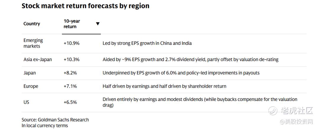 最近高盛发布了《2025-2035全球股市十年展望》。这份报告之所以重要,是因为它并未纠结于短期的涨跌,而是从资产定价(Asset Pricing)的底层逻辑出发,对过去十年“美股独大”的趋势提出了修正预警。 $高盛(GS)$