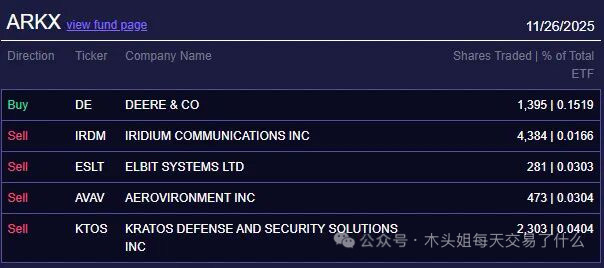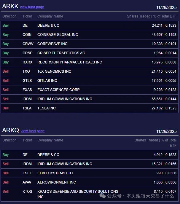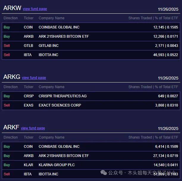 木头姐今天买入1650万美元COIN、买入1500万美元DE、买入77万美元CRWV、买入45万美元KLAR、买入13万美元CRSP、买入6万美元RXRX。
