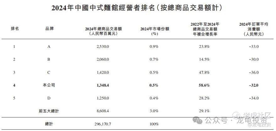 竞争格局,按2024年总商品交易额计,遇见小面是第四大中式面馆经营者,市场份额为0.5%;且本公司亦是最大的川渝风味面馆经营者,且2022年至2024年连续三年,在中国所有餐饮连锁企业中,重庆小面、红碗豌杂面和金碗酸辣粉的线下销量排名第一。此外,本公司为中国前十大中式面馆中增长最快的企业,2022年至2024年的总商品交易额年复合增长率最高。