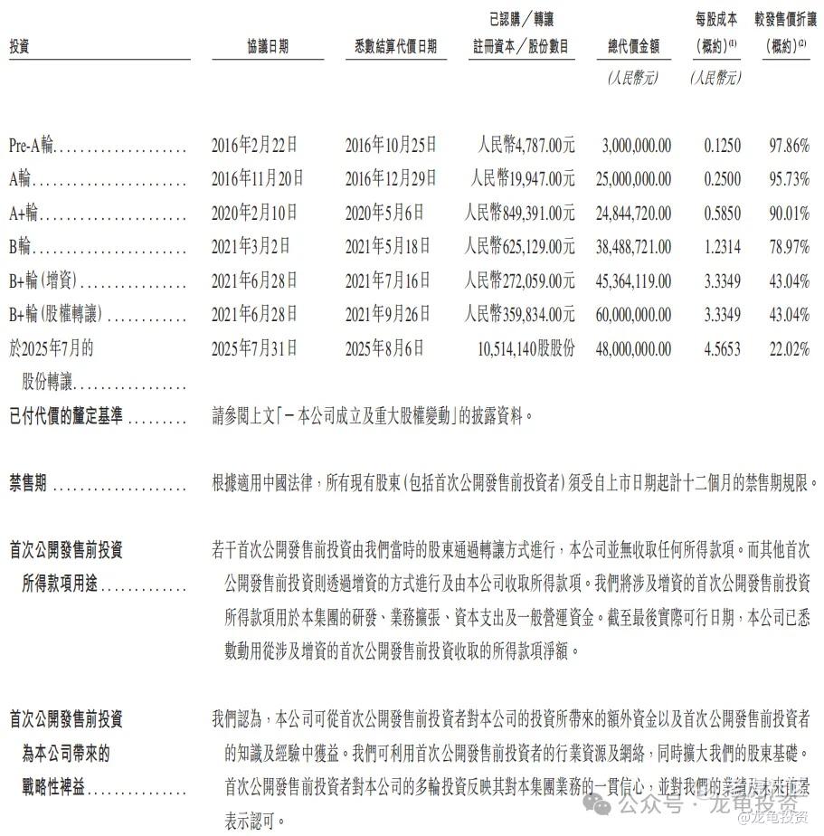 公司首次公开发售前投资总共完成多轮投资,最后一轮投资完成时间2025年7月,总代价金额4800万人民币,投后每股成本4.5653元人民币,较发售价折让22.02%;相比海伟的溢价44.34%反而正常多了。基石引入高瓴资本在内的六位基石投资者,认购金额2200万美元,约合1.71亿港元,按上限价占比24.95%。