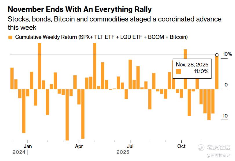 标普500 本周上涨 3.7%,为六个月以来最强单周表现。Bitcoin 重返 90,000 美元上方;两年期美债收益率下行;大宗商品反弹同步加强。这是典型的“趋势恢复型反弹”,而非短期脉冲。