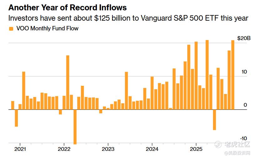 管理规模高达 8,200 亿美元的 Vanguard S&P 500 ETF 今年流入资金已达约 1,250 亿美元,该基金年内涨幅约 17%,有望再次创下年度资金流入纪录。