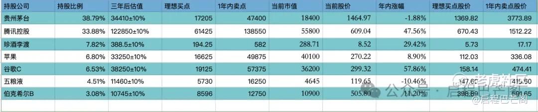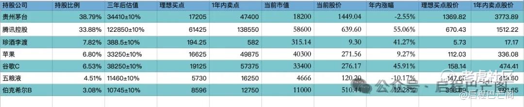 目前十大持仓:贵州茅台39%,腾讯34%,珍酒李渡7%,苹果7%,谷歌6%,五粮液4%,伯克希尔3%。目前九大持仓占比88%(其中科技股占比47%,白酒股占比50%;A股占比43%,港股占比41%,美股占比16%),还有12%观察仓和现金。