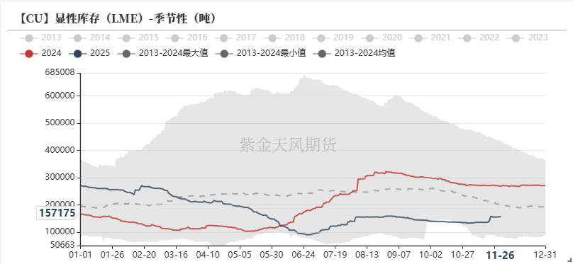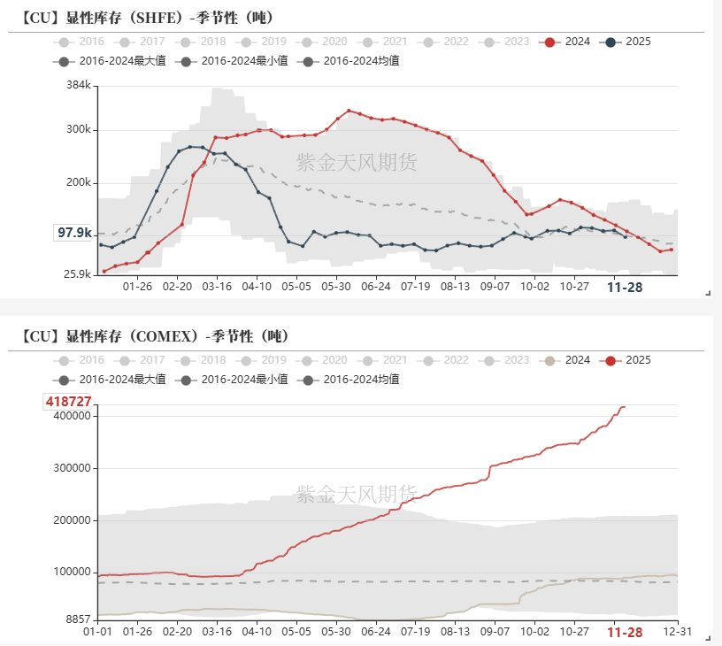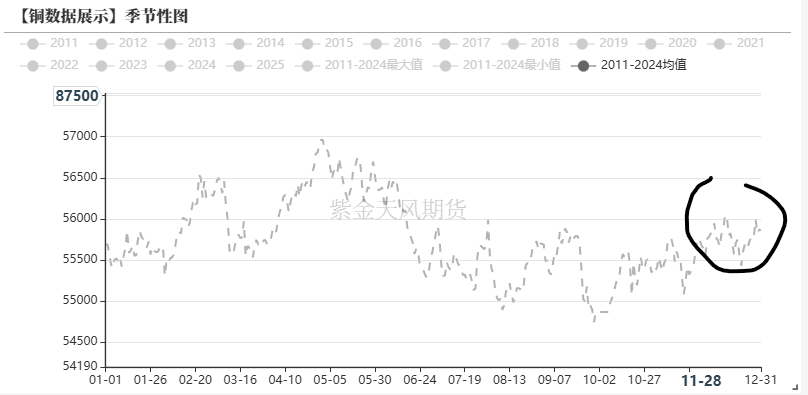 十二月对于铜来说一般是一个预期波折的月份,季节性的底部往往出现在10月份,12月是一个对于明年经济预期展望然后确定库存预期的时候,预期不好库存低,预期好库存高,今年其实也没有太多不同,但预期变得困难一些。
