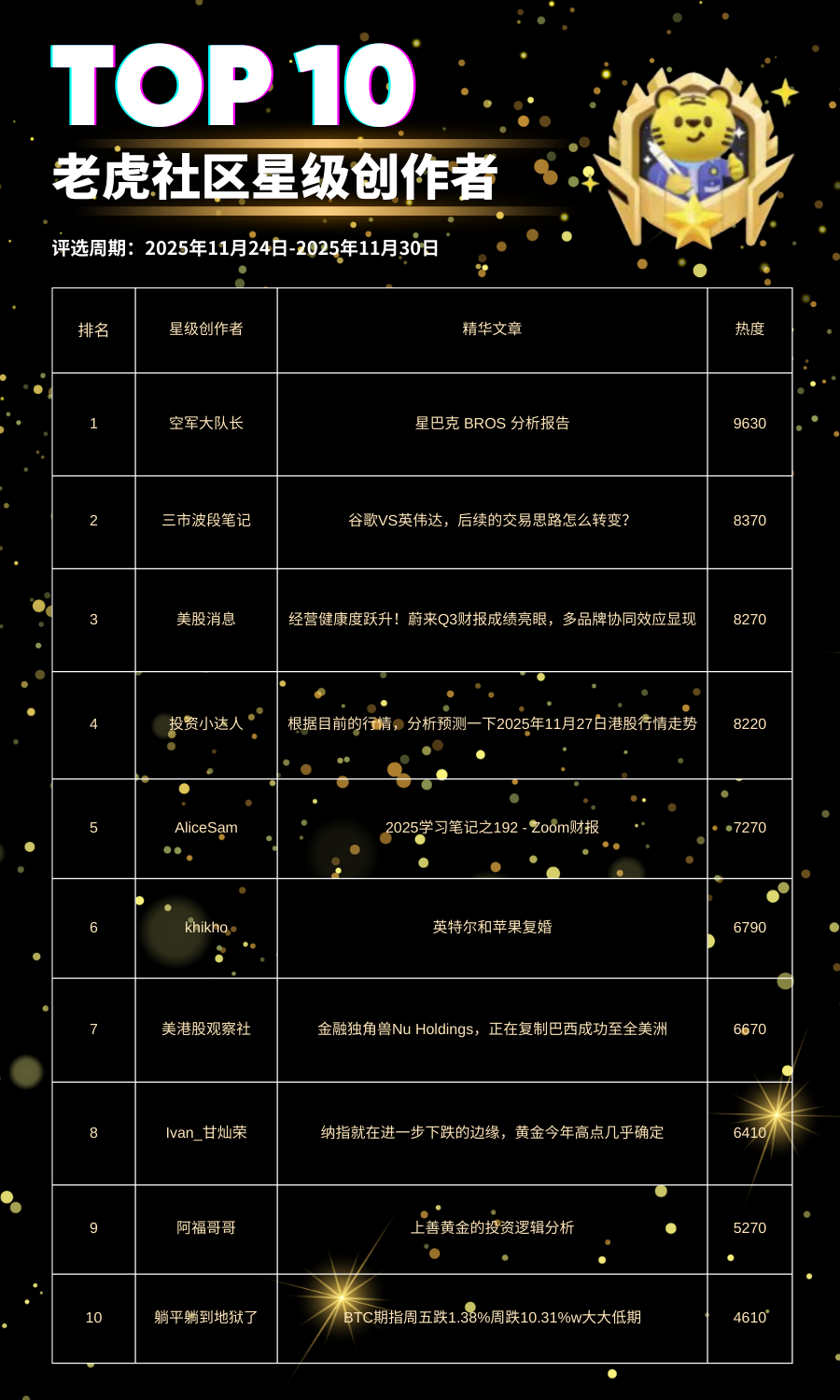 欢迎来到【星级创作者】奖励活动!在此活动中,我们每周都会向获奖创作者发布丰厚奖励哦[财迷][财迷]。此外,获得星级创作者徽章,还可享受社区专属流量激励与虎币奖励[你懂的]
