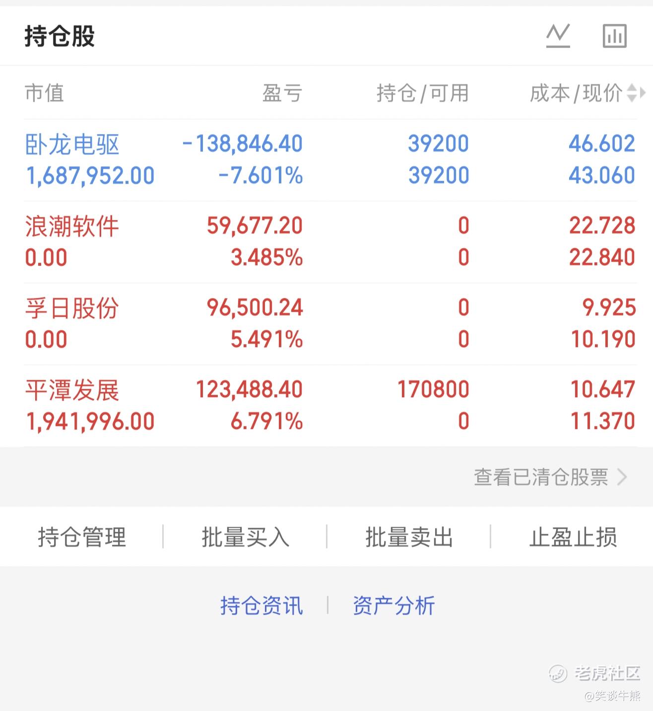学会评估自己的风险承受能力,在结合自己的收入以及财务状况,合理的评估自己能承受的风险,确定好自己的投资规模。学会仓位控制,切记把自己的全部身家都投入股市,用闲钱投资,可以采取分批买入,给自己留30% 的后路,用于加仓或者做T$平潭发展(000592)$ $浪潮软件(600756)$ $孚日股份(002083)$