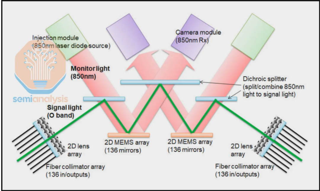 光互连的另一优势是能耗效率。光信号在OCS中无需进行光电转换,直接通过物理反射完成路由,比传统的电子数据包交换节能显著。