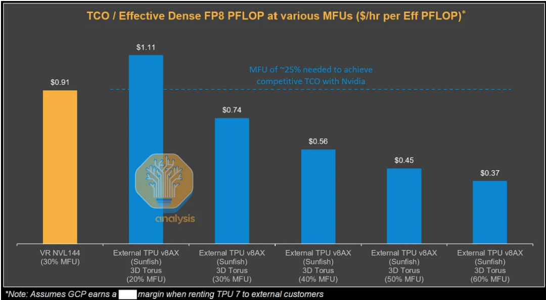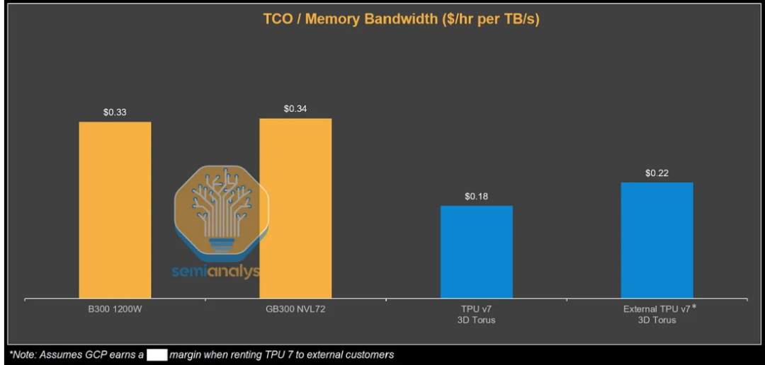 根据测算,从谷歌视角看,TPUv7服务器的总拥有成本比GB200服务器低44%。即便计入谷歌和博通的利润空间,外部客户通过GCP使用TPU的TCO仍比GB300低30%。