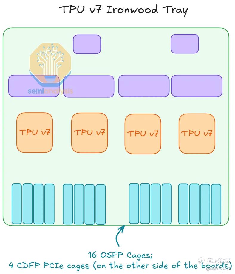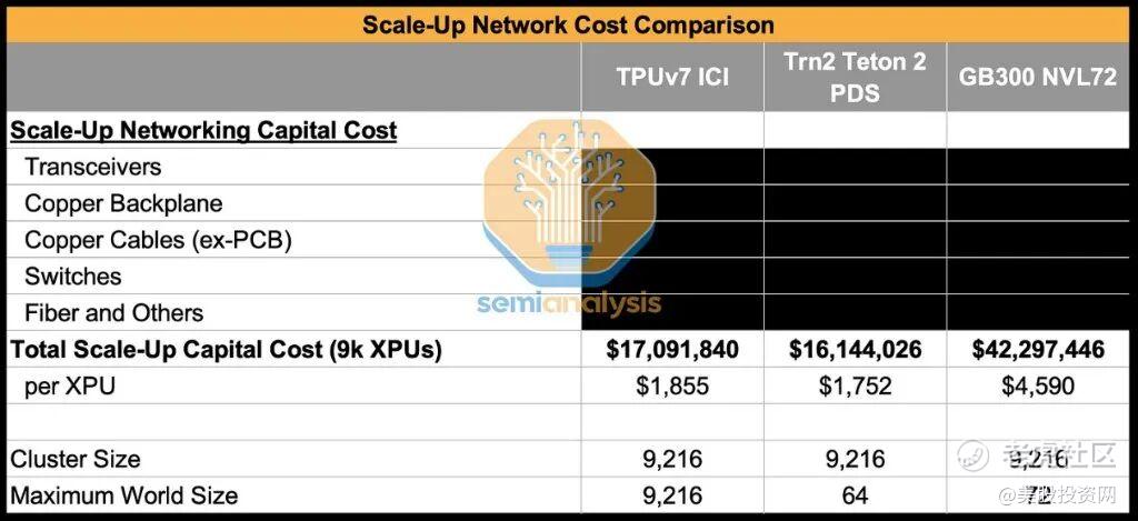 一个 TPUv7 Pod 可扩展至 9216 颗芯片(远高于英伟达的 64/72 卡结构)