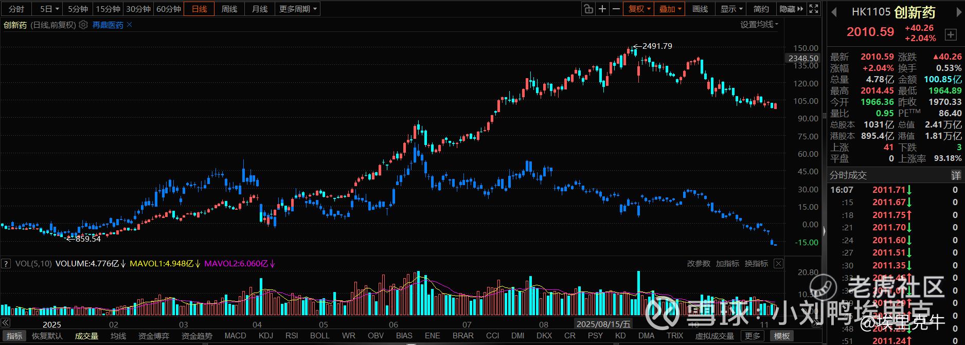 这三根大阴线,每次都是跌个10%以上,10.17-10.20那几天还有一段阴跌我用红圈圈出来了,实在想不到那阵子是否有事件驱动?如果有知道的朋友麻烦告诉我一下。对于跟踪再鼎的投资者来说,基本都能知道其Q3完不成业绩指引,因此我推测10月中旬大家都开始慢慢跑路?