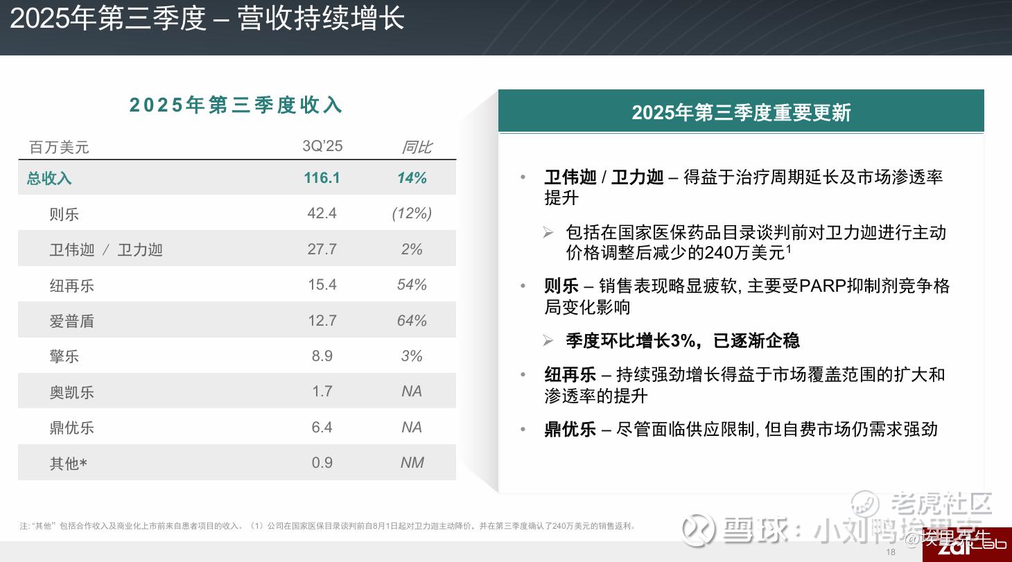 I、则乐®尼拉帕利:现金奶牛产品。作为再鼎医药的第一款商业化产品和支柱,1500万美元首付款+4050万的里程碑付款拿下了大中华区权益。则乐的成功使公司从Biotech进阶为Biopharma。它目前已进入产品成熟期,增长趋于稳定,其价值主要体现在提供持续的现金流。PARP抑制剂的核心作用机制是基于“合成致死”效应,我们体内的细胞有两条主要的DNA损伤修复路径,一部分癌细胞天生就缺乏另一条叫做“同源重组修复”的路径。PARP抑制剂的作用就是阻断PARP这个“帮手”。对于健康细胞来说,关闭一条路径还有备用路径,所以影响不大。但对于已经缺乏备用路径的癌细胞来说,同时阻断两条路径就等于切断了所有修复希望,DNA损伤无法修复,最终导致癌细胞凋亡。国内PARP抑制剂赛道已非常拥挤,除则乐外,还有奥拉帕利等一堆产品上市。我个人理解啊,则乐作为PARP抑制剂市场的后来者,其成功的关键正是在于精准地选择了差异化竞争策略,切入了一个被先行者忽略但潜力巨大的细分市场(卵巢癌),并由此建立了自身独特的优势,在这个细分领域当时没别家,所以则乐成功了。拓展到别的适应症其实也能做出来疗效,但是考虑到商业上的投入产出比压根别想了。公司已在年报电话会透露“不会继续大规模投入PARPi新适应症”,未来几年,则乐的收入很可能不会大幅上升,更可能呈现缓慢下降,最乐观也就是基本维持现状的趋势了。