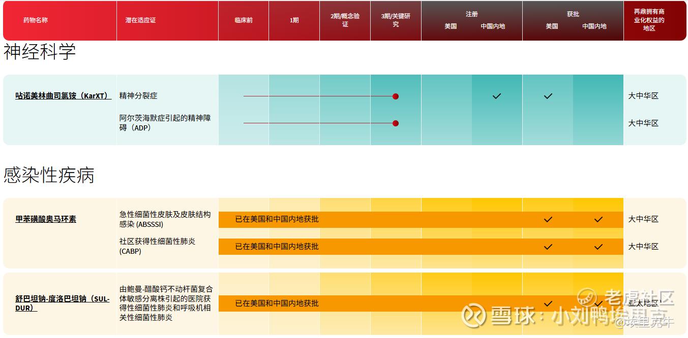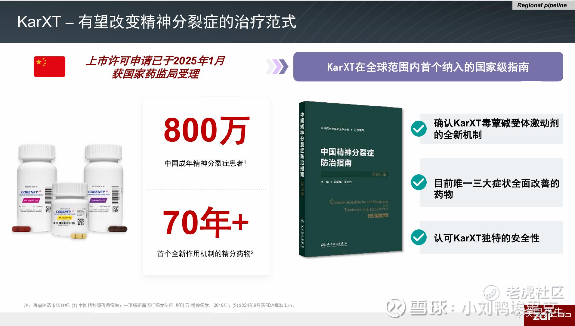 但毫无疑问,KarXT是个重磅好药,也是保守估计未来可以期待销售峰值超过10亿RMB的大单品。首先,KarXT纳入了指南,这个份量非常重了,注意这是指南不是专家共识,上指南这件事足以证明公司的优秀。再考虑精分的治疗中心在国内总体比较集中,头部500家医院覆盖85%的市场,公司规划今年几十人销售团队,预计26年开卖。上指南+细分领域的集中度高意味销售团队无需太多且未来起量会比较快。精分领域是一个临床需求严重未被解决的领域,目前的阻断多巴胺受体的药物没办法解决患者的临床需求,我见过临床相关的问题,因此对这个药有自己的情怀,我希望能有更好的药,能解决更多患者的需求