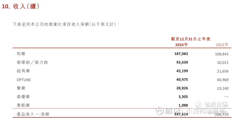 两张图对比来看,公司的收入是持续增长的,第一代已经商业化的产品主要包括2019年上市的则乐®尼拉帕利、2020年上市的爱普盾®肿瘤电场治疗、2021年上市的擎乐®瑞派替尼和纽再乐®甲苯磺酸奥马环素。我也经常记不住药品的商品名,可以看出来再鼎的商品名基本都喜欢带“乐”字,这几个带乐的产品弄得我老是混淆。