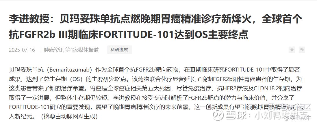 II、贝玛妥珠单抗–目前唯一一款处于临床后期的FGFR2b靶向疗法。目前基本已经凉了,早在2017年,再鼎医药就识别出FGFR2b这个靶点在胃癌等领域的潜力,并引进了当时尚在早期阶段的贝玛妥珠单抗,再鼎医药并非简单的许可引进,而是深度参与了药物的全球临床开发策略。然后根据2025年6月的公告,其关键性三期临床研究FORTITUDE-101在中期分析中达到了总生存期(OS)的主要终点,显示出一线治疗FGFR2b阳性胃癌的巨大潜力。期间中国区临床总PI李进教授透露的中国亚组数据靓丽,我当时看完觉着稳了,稳得不行了。