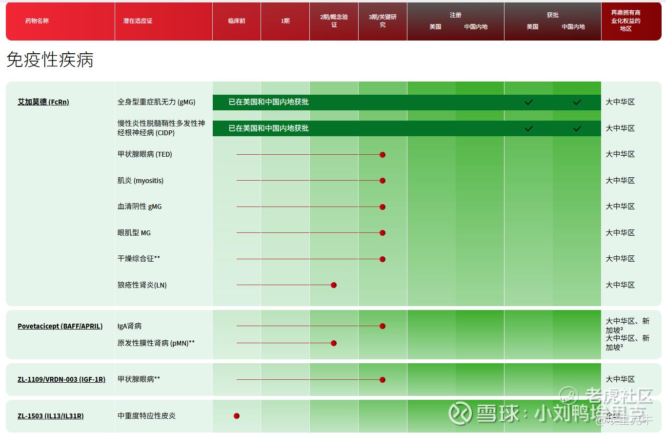 I、艾加莫德(通用名:Efgartigimod,商品名:卫伟迦®)是一款在自身免疫疾病治疗领域具有突破意义的药物。7500万美元+1亿美元再鼎股票引入的。那会再鼎美股股价是132美元,现在是21美元,再鼎花股票支付货款笑麻了哈哈。艾加莫德的核心机制是精准靶向FcRn。在人体内,FcRn像是一个“回收站”,负责保护IgG抗体(包括许多致病性抗体)不被快速分解。艾加莫德则能高亲和力地“占据”这个回收站,使致病性IgG抗体无法被回收,从而被自然清除,迅速降低其血药浓度,从源头上缓解病情。作为国内该靶点领域的先行者,艾加莫德已率先获批并纳入医保,在医生认知和市场覆盖上占据有利位置。严格来说这是再鼎手握的第一款上市的“硬菜”,这最起码相当于东北菜里的杀猪菜了。。。目前核心适应症是全身型重症肌无力(gMG)和慢性炎性脱髓鞘性多发性神经病(CIDP),未来再按照上表的滚动扩大适应症拓展至其他自免领域。咱们算下目前的患者人群,全身型重症肌无力(gMG)存量患者 ≈ 20 万,其中 AChR 抗体阳性≈85%(17 万)。生物制剂渗透前体人群(对 SOC/激素/免疫抑制剂控制不佳)估计 30-40% ≈ 5-7 万人。慢性炎性脱髓鞘性多发性神经病(CIDP)患病率约 2-3/10 万,对应存量 3-4 万人;其中 60% 为难治/激素依赖型,即 1.8-2.4 万人。多家券商模型在 30-50 亿人民币,我预测中国峰值肯定超过则乐成为下一代“现金牛”,Q3实现2770万美金销售,年化自己算下。这东西是好,但是你要让我猜未来峰值大概到多少,我真的摸不准。。