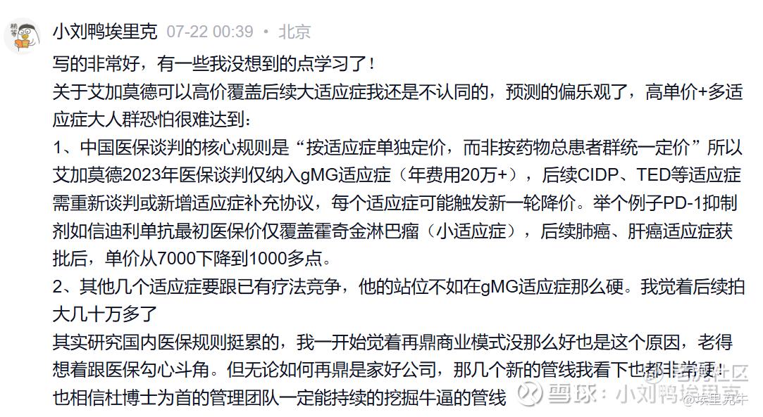 自免学科药物我自己个人的理解:在中国自免药物商业成功绝非一个简单的“好药就能大卖”的逻辑题(上一代全球药王修美乐在国内并不好卖),临床数据只是拿到牌桌资格,后面全是政策博弈+支付艺术+患者漏斗运营的连环坑:医保谈判价格一刀下去,后续年年削价保量,年年砍受得了不;每开一个适应证,要补真实世界、要重新谈报销、要和不同科室再社交。院内的科室也不同,肾内科、风湿科、皮肤科、神经科四大自免阵地。自免的药物销售峰值是一条随着政策、价格、竞对、科室博弈不断上下移动的“活靶”。真的不要随便相信卖方分析师或者某些大V张口就拍百亿,自免是我理解商业化最为复杂的医学学科。但从再鼎过去的商业化成功经历来看,我选择相信一直成功的团队,我也选择有阿尔法的公司。