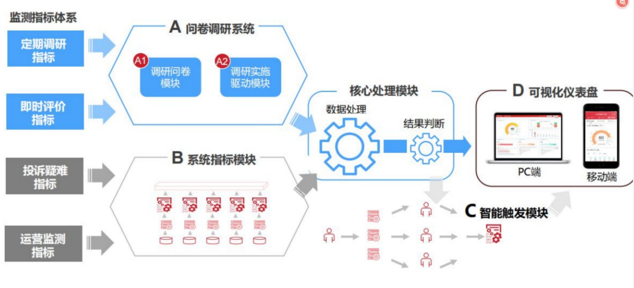 全面:涵盖全口径客户、线上与线下多渠道、核心业务产品线,通过客户旅程触点问卷主观数据以及运营客观数据相结合,构建体验监测的数字化平台;