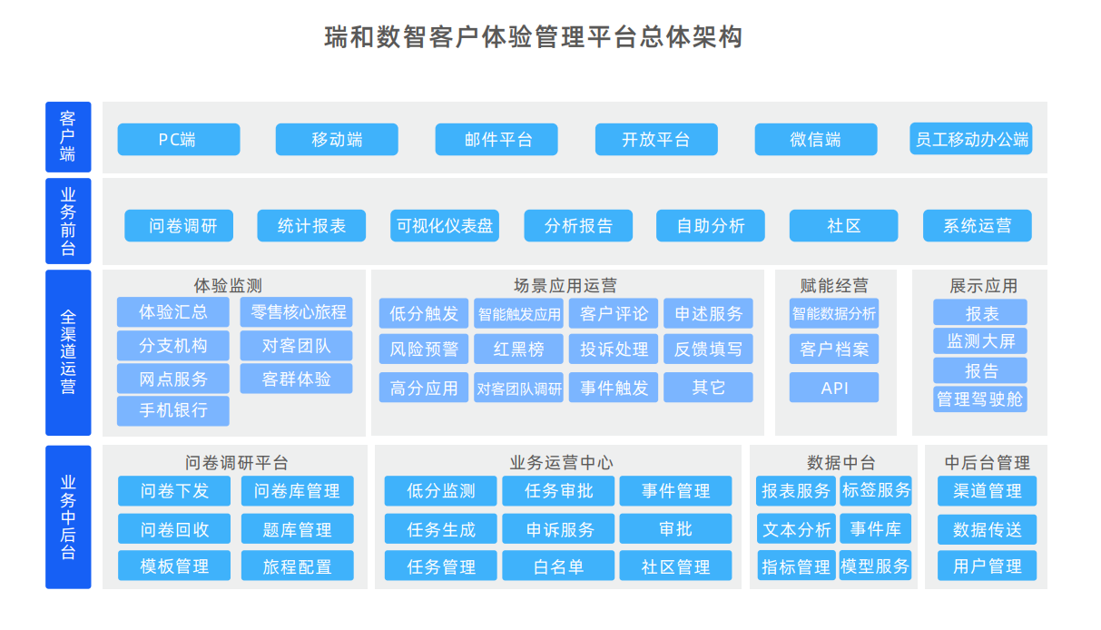 在数字化浪潮与存量竞争交织的金融新时代,客户体验管理已从“锦上添花”跃升为银行构筑核心竞争力的战略基石。瑞和数智凭借深厚的技术积累与行业洞察,为客户体验管理体系的构建与落地提供了坚实支撑。