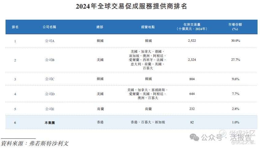基于2024年买卖双方按总额基准计算的交易量,公司在全球在岸数字资产交易促成服务供货商中排名第六,是亚洲最大的区域性在岸数字资产交易促成服务供货商,且是香港最大的数字资产交易促成服务供货商。