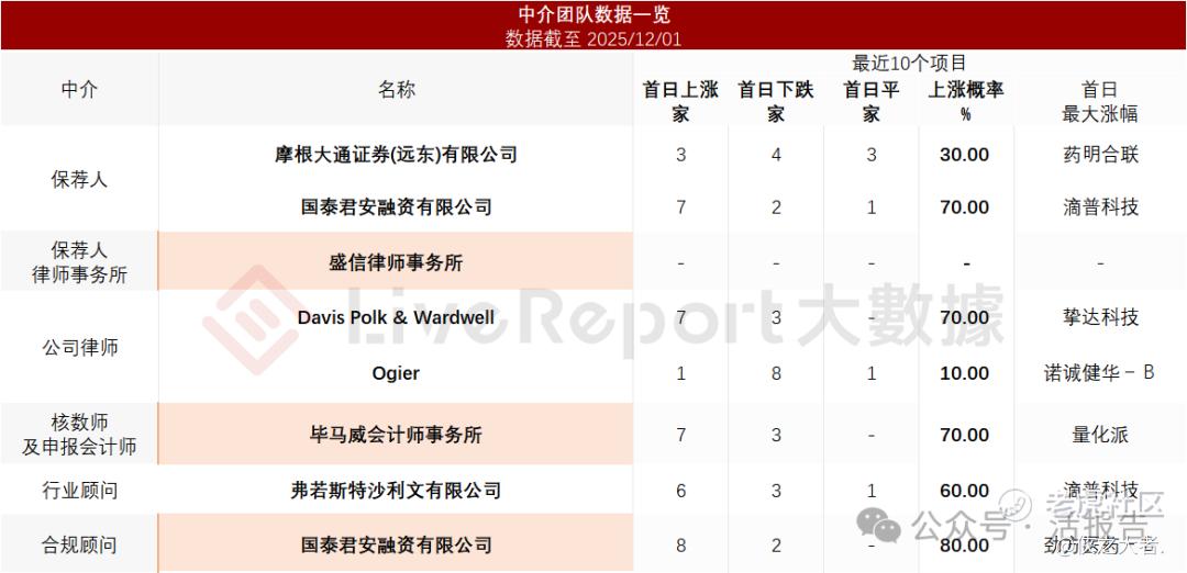 据**大数据统计,HashKey中介团队共计8家,其中保荐人2家,近10家保荐项目数据表现不理想;公司律师共计2家,综合项目数据表现糟糕。整体而言中介团队历史数据表现有待加强。