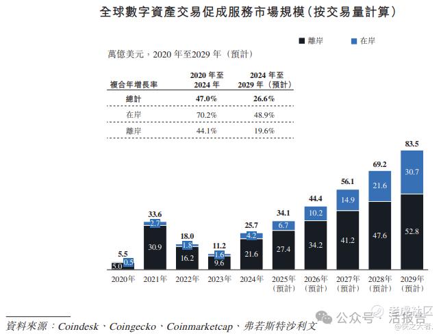 据弗若斯特沙利文(Frost & Sullivan)的资料,以单边交易量计算的全球数字资产交易促成服务市场规模,已从2020年的5.5万亿美元增长至2024年的25.7万亿美元,复合年增长率为47.0%;预计将以26.6%的复合年增长率持续扩张至2029年的83.5万亿美元。