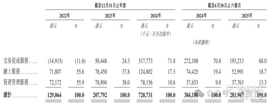 于往绩记录期间,公司的收入主要来源于(i)交易促成服务,(ii)链上服务,以及(iii)资产管理服务。