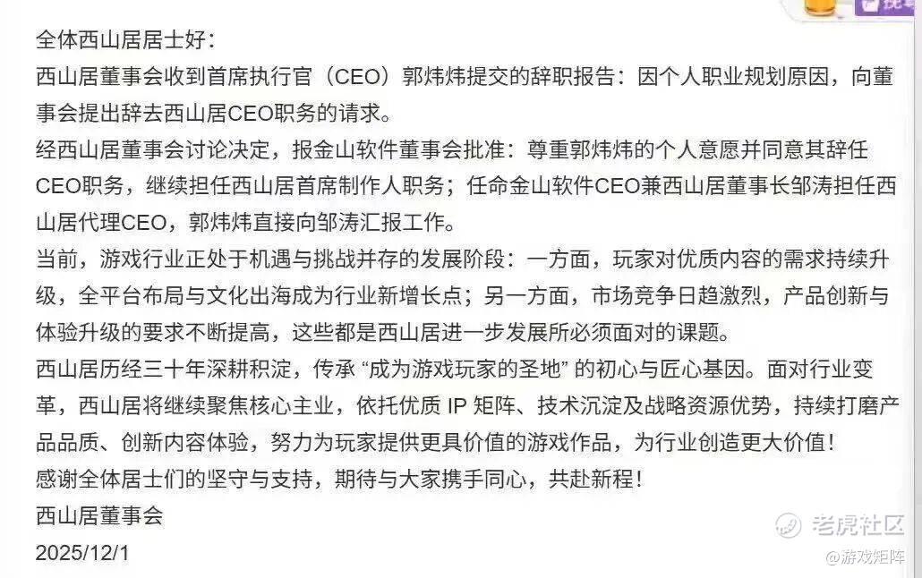 昨日,西山居曝出重大人事调整。据一封内部信显示,现任CEO郭炜炜因个人原因提出辞去西山居CEO职务。董事会同意其辞任CEO,继续担任西山居首席制作人,同时任命金山软件CEO兼西山居董事长邹涛担任代理CEO。郭炜炜直接向邹涛汇报工作。