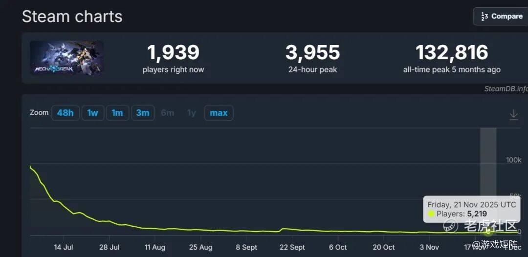 然而游戏上线之后不到一个月的时间,玩家在线人数就出现断崖式下滑,跌到不足万人。9月19日,游戏S1赛季上线。尽管制作组做了很多努力,推出了新的机甲,上线新玩法,调整了平衡机制,还参加了今年的TGS、AGF等展会加大自己的声量,想通过“听劝”人设来挽回人气,但效果并不明显。