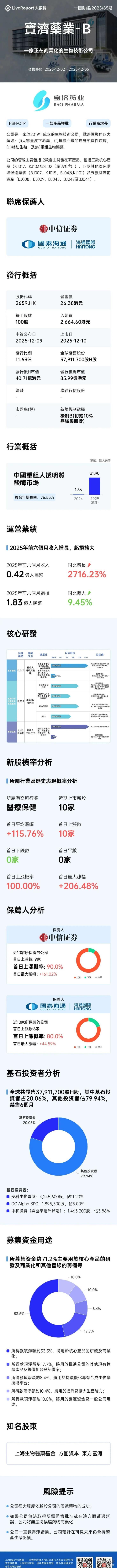 宝济药业-B(2659.HK) 开启招股,招股日期为2025年12月2日至2025年12月5日,并预计于2025年12月10日在港交所挂牌上市,联席保荐人为中信证券、海通国际。