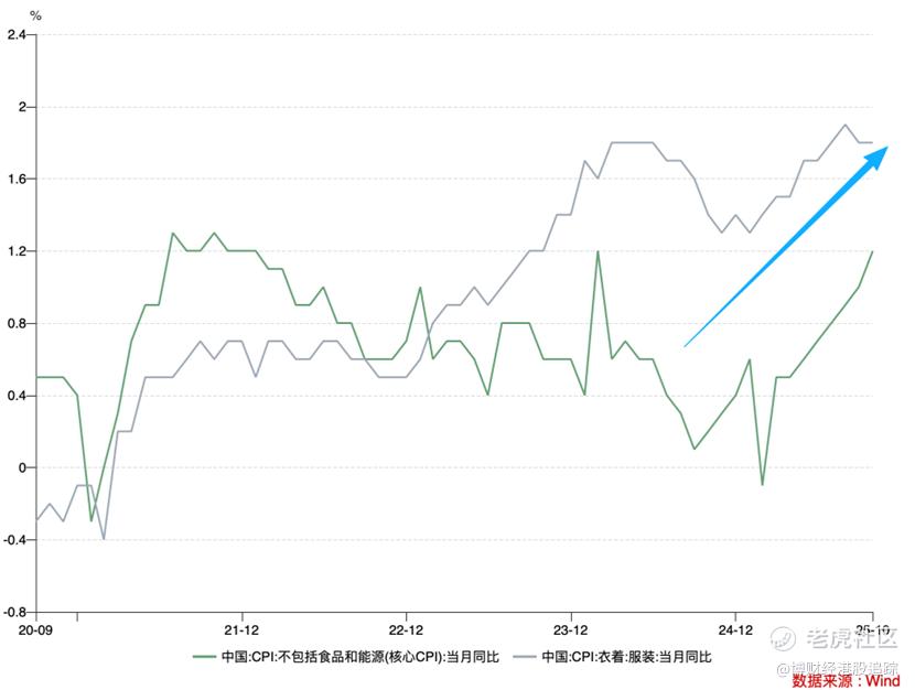 固然内地CPI已经低迷许久,但剔除能源和食品后的CPI同比增长已经反弹至今年新高;值得注意的是,本次核心CPI的反弹并非源于低基数效应,这与2021年和2024年的情况有本质不同,其中服装行业CPI同比甚至已经接近2%大关。
